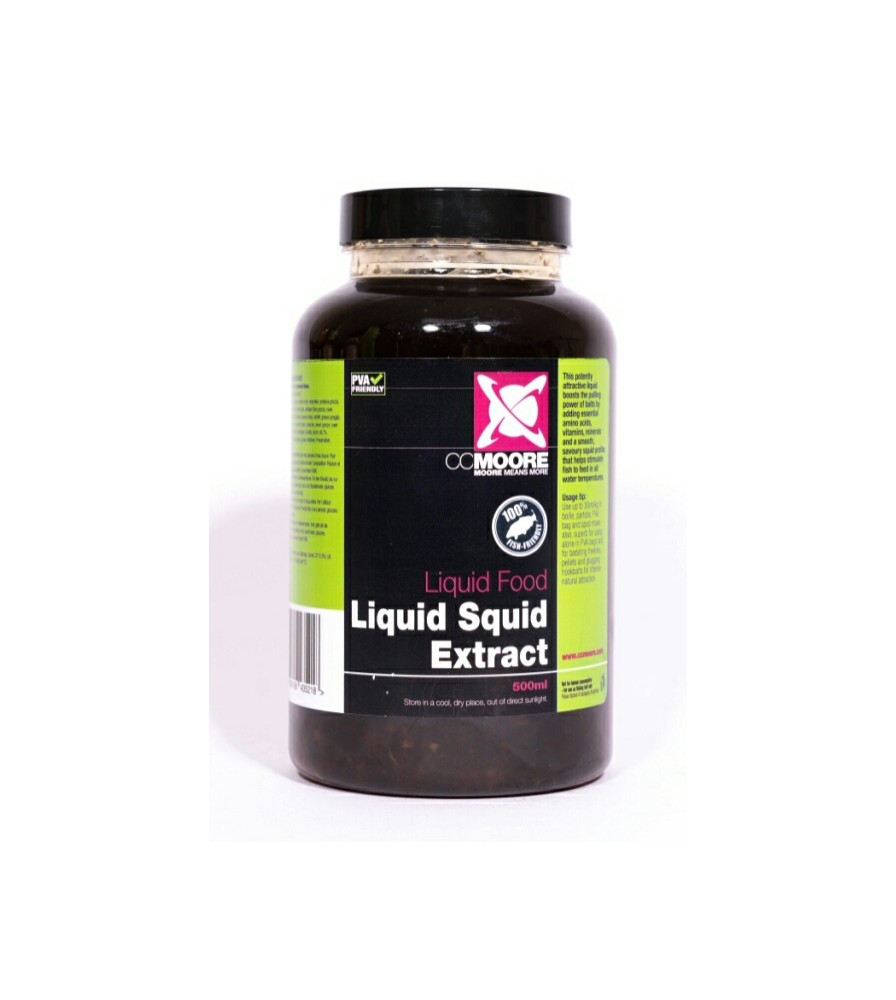 Liquid Squid Extract от торговой марки CC Moore -это замечательный ликвид который сочетает в себе мощные аттрактанты для рыбы, полученные из свежего мяса кальмаров, и растворимые рыбные белки. Все вместе превращает в жидкое питание невероятной привлекательности для карпов и на расстоянии подает сигнал о наличии пищи. Это еще одна боевая единица в элитном батальоне натуральных рыбных экстрактов от CCMoore в сочетании с подразделением моллюсков. Как и все остальные экстракты, здесь нет ни капли химических, синтетических и других добавок. Никаких ароматизаторов, красителей и прочего лиш чистый кальмар, запах и аромат . Таким образом, были сохранены все питательные вещества, которыми обладает данный тип моллюсков. Ликвид хорошо дружит с ПВА и не будет его растворять. Консистенция достаточно плотная, с мелкими частичками мяса кальмара. Так что помимо жидкой составляющей, в ликвиде присутствует и «живое мясо». Кислотность ликвида — 5.8pH. Экстракт жидкого кальмара (содержит частицы чистого кальмара) Эта замечательная приманка для жидких приманок сочетает в себе мощные аттрактанты из рыбы, полученные из чистой плоти кальмара и растворимых рыбных белков, и превращает их в одну непреодолимую жидкую пищу. Содержащие мощные натуральные рыбные экстракты и свежее, смешанное мясо кальмаров эта богатая, очень привлекательная острая жидкость кальмара добавляет интенсивные природные, стимулирующие аппетит аттракторы к карпам и грубым приманкам для рыб всех типов.